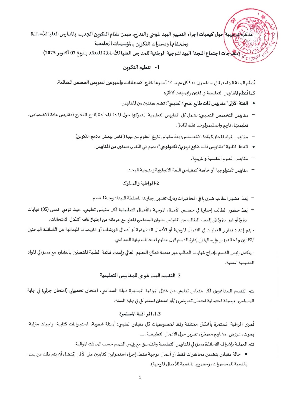 حضور الدروس (المحاضرات) ضروري، وتترك إجباريته لتقدير الفرقة البيداغوجية. أما حضور الأعمال الموجهة والأعمال التطبيقية والدروس التطبيقية (مقاييس بدون تطبيق) فهو إجباري ويجب على الأستاذ مراقبة الحضور في كل حصة .